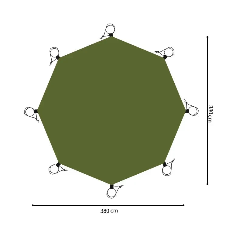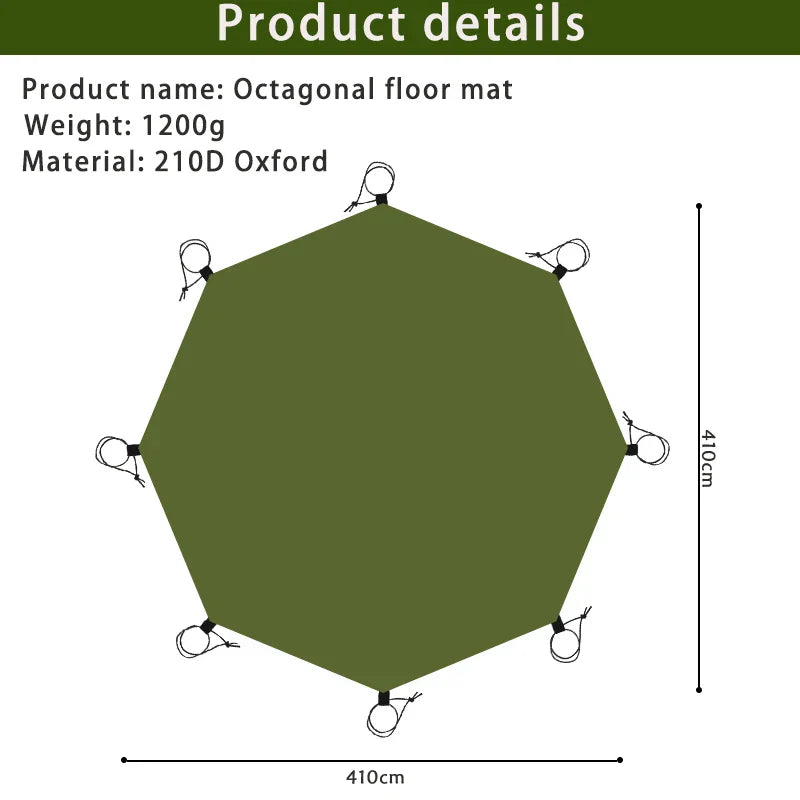 Spacious hexagon/octagon shape offering ample space for family and friendsWaterproof and easy to clean, ideal for picnics, camping, beach trips, and moreLightweight and portable design with a convenient carry bag for easy transportReinforced corners with stakes for secure placement on windy daysMulti-purpose use as a ground sheet, footprint, tarp, awning, or shadePerfect for travel, hiking, and outdoor gatherings