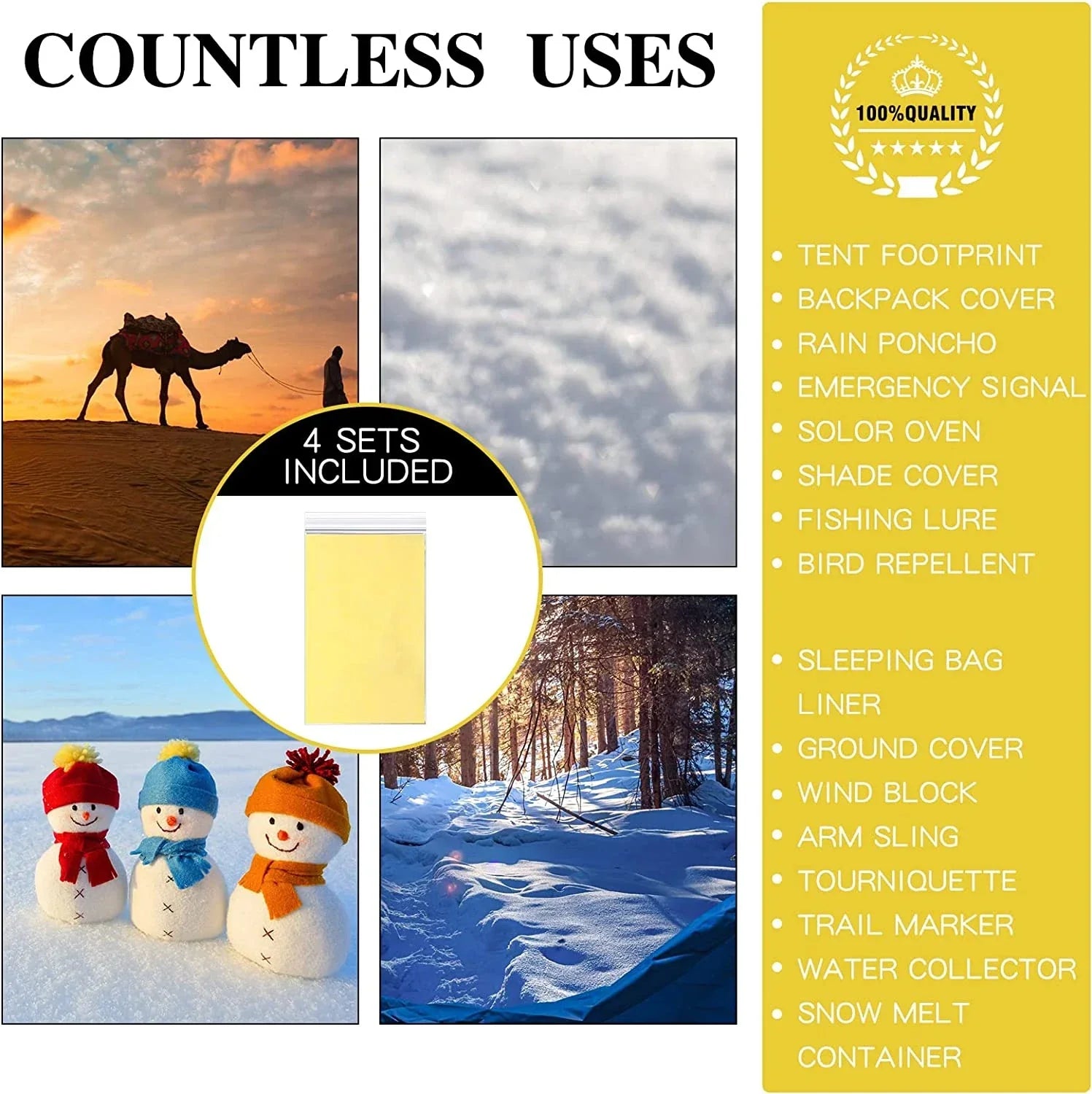 Prepare for any outdoor adventure or emergency with these versatile gold-silver survival blankets. Essential for hikers, campers, and first responders, these blankets provide crucial warmth and protection in unpredictable conditions.