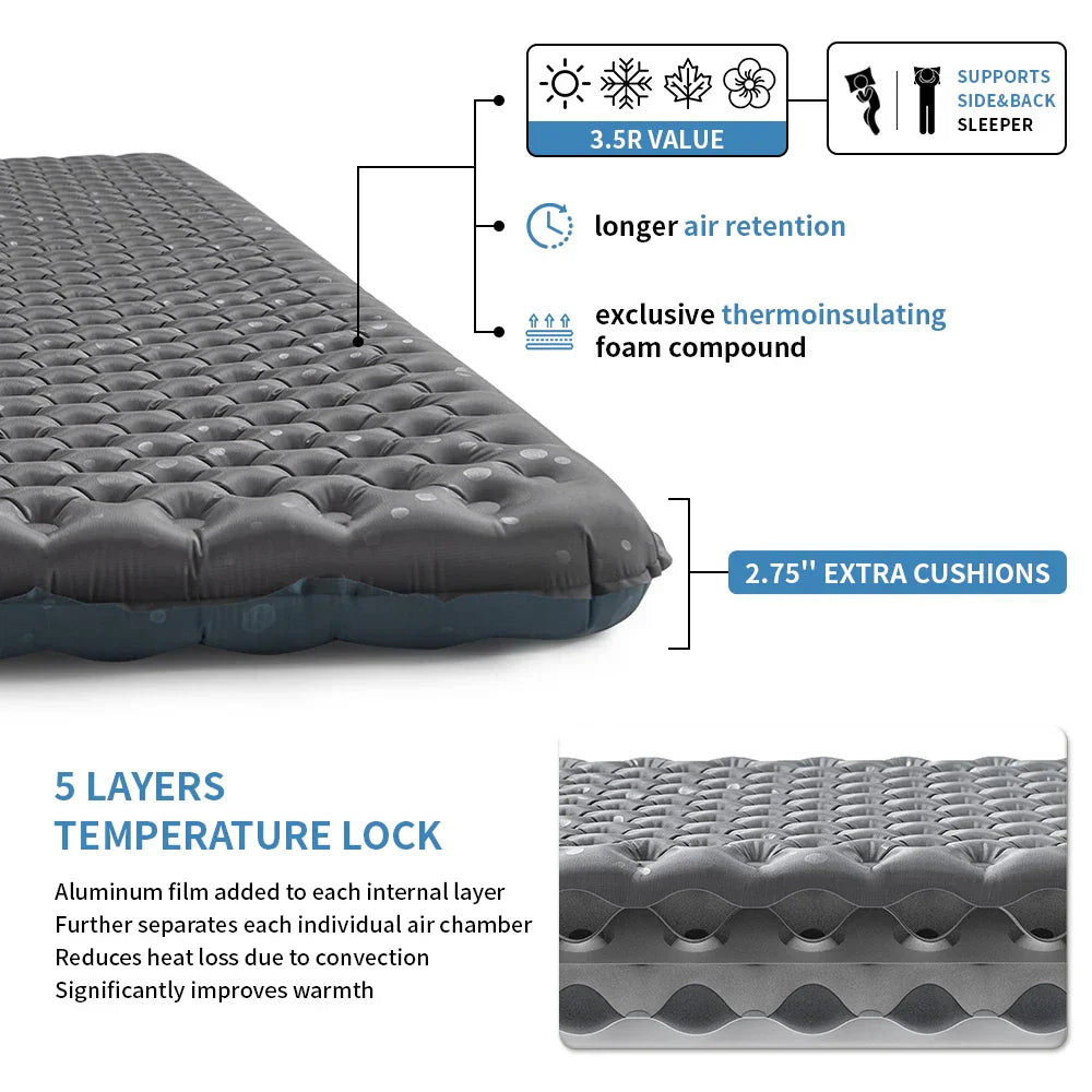 Compact and portable design, easily fits into backpacks for travelInflates quickly with an efficient air valve system, saving time and effortOffers a comfortable 3.5 R-value, providing insulation and warmthDurable construction ensures long-lasting use in various outdoor conditionsPerfect for camping, hiking, backpacking, or any outdoor adventureConvenient storage bag included for easy packing and transport